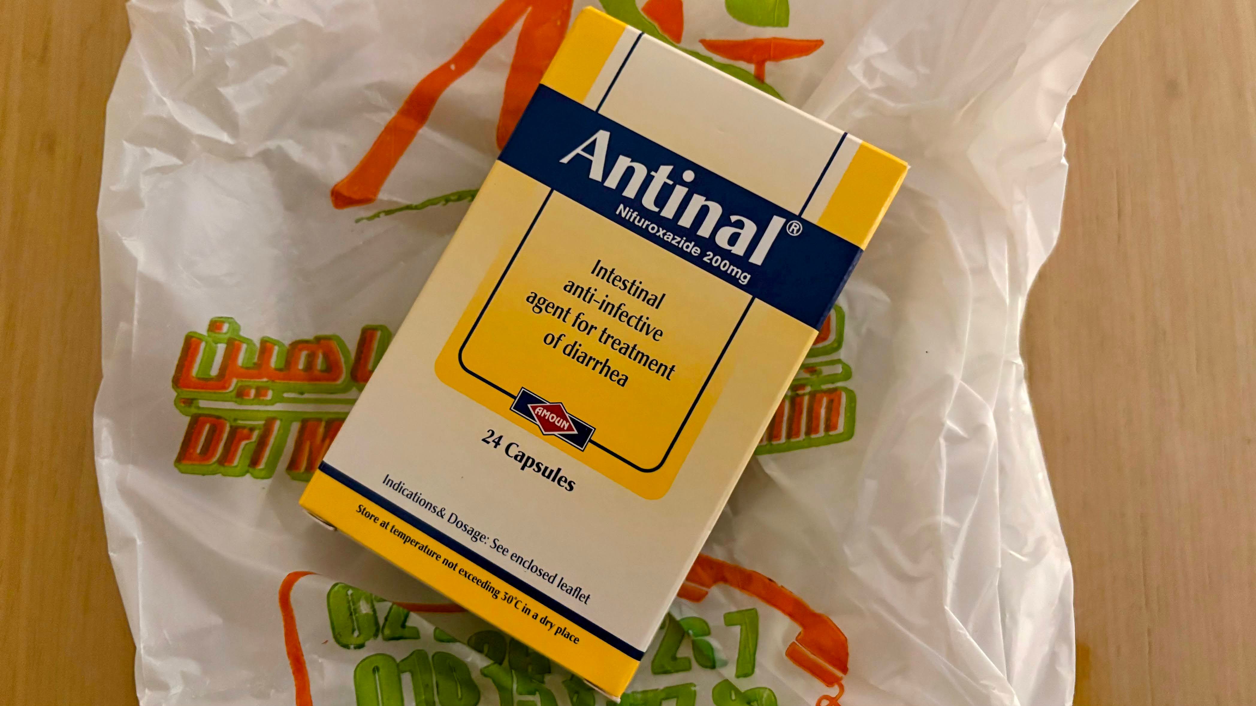 いい加減に下痢を止めないと仕事にならないので,カイロのスタッフさんにAntinal(成分:ニフロキサジド)を届けてもらいました.取説を隅々まで読んでから服用します.人間用なので安心ですね.