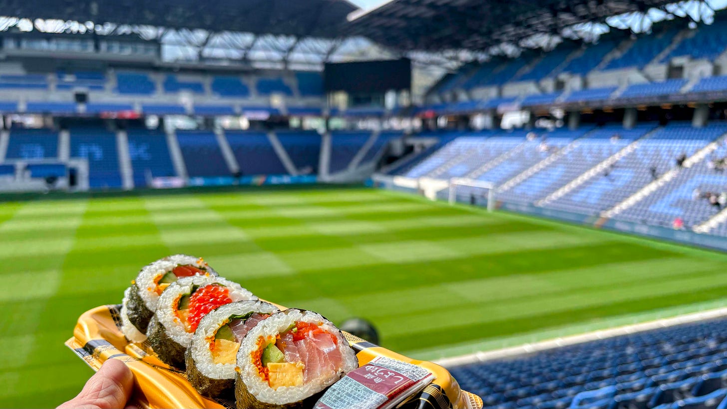 13:00からのオンライン打ち合わせまでに30分ほど時間があったので長崎スタジアムシティのフードウェイで太巻を買い求め,ピーススタジアムで昼食にしました.昼食はできるだけ自分のデスク以外で食べるようにしているのです.デスクだとついつい食べながら仕事しちゃいますから.