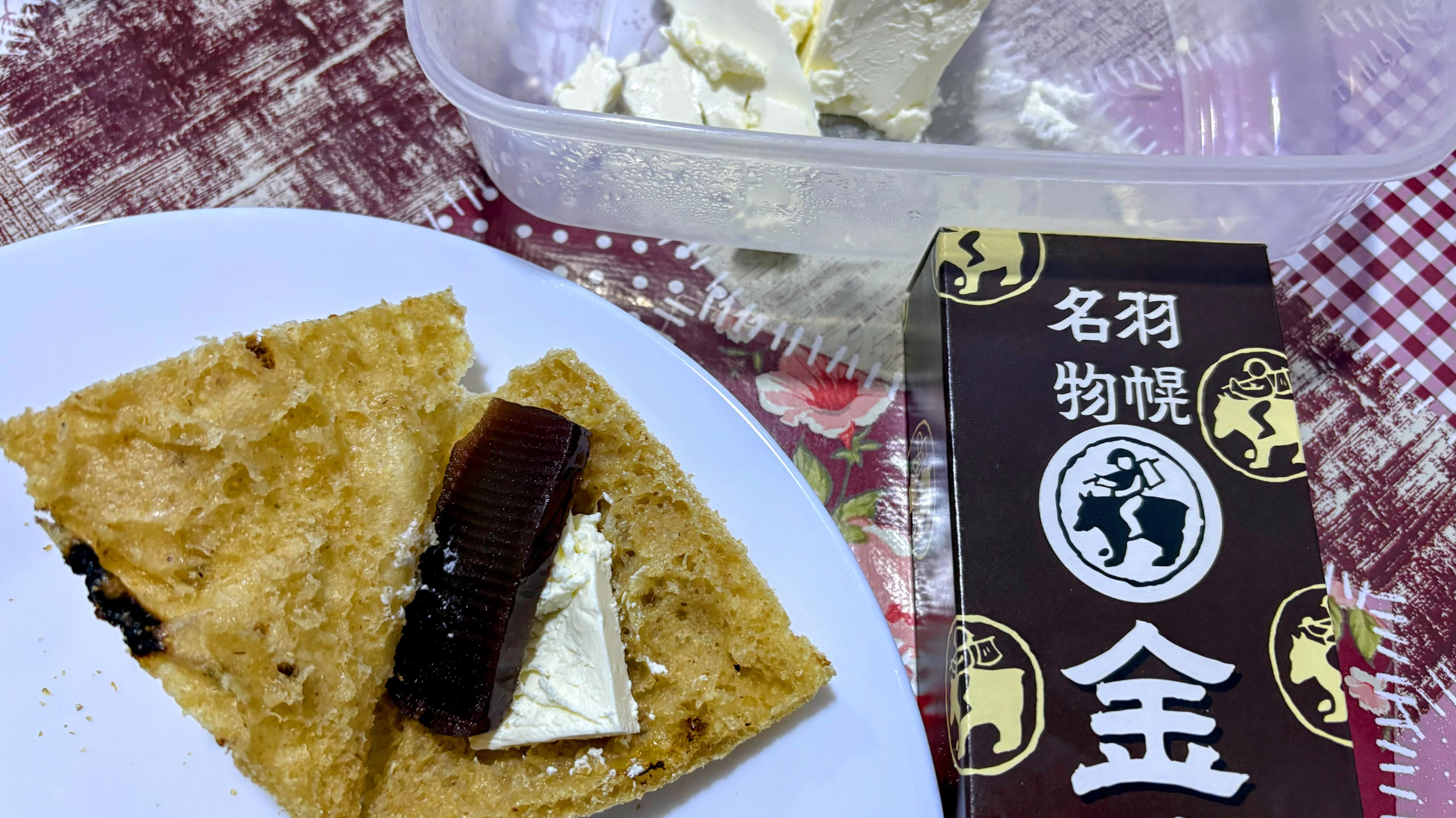 エジプト版小倉トーストです.アエーシにエジプトチーズと薄切りの羊羹を挟んでみました.