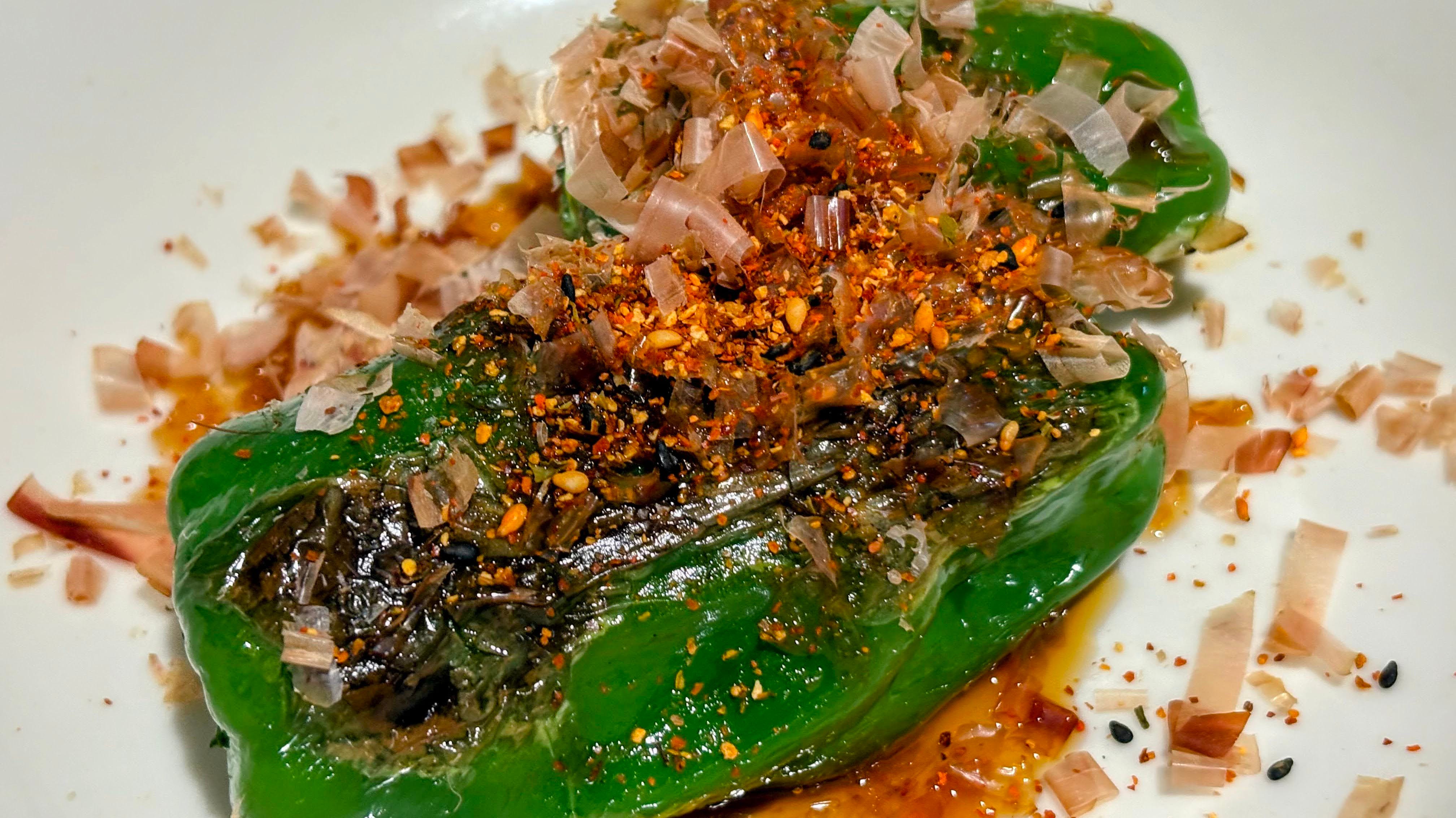 帰り道に「ピーマン,レシピ」でネット検索してみたところ,ピーマンに切れ目を入れて,ごま油で焼いてから蒸気で蒸して,出汁と醤油,鰹節,七味を振るレシピが上位に出てきました.で,これを才能と呼んで良いのかどうかわからないのですが……僕は一瞬でも見た料理のレシピは忘れないので,このピーマンレシピもばっちり記憶しました.1