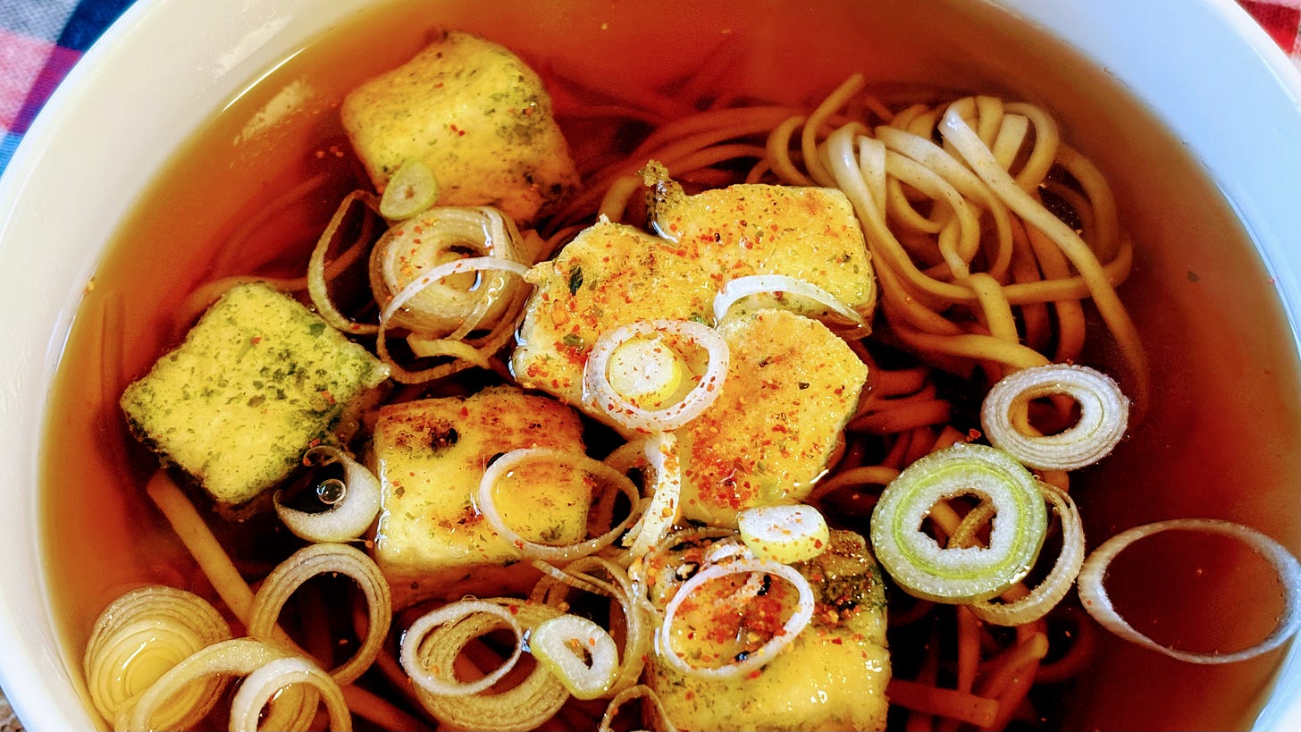 今日は自宅で早めの昼食を作ってから出勤しました.昼食は揚げ豆腐ぽいなにかを蕎麦に浮かべたものにしました.たぬき(上方語で「きつねそば」のこと)にしたかったのですが,お揚げさんが無かったので適当に作ってみました.