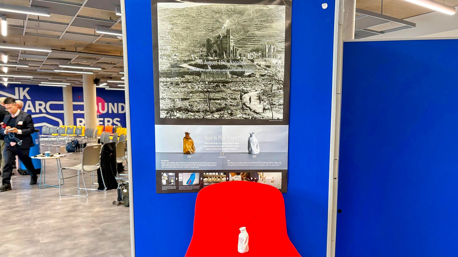 このカンファレンスでは,運営チームメンバーとしてひとつだけわがままをお願いしました.それが「祈りの花瓶」のポスター発表をさせてもらうこと.本プロジェクトは長崎出身のデザイナー毎熊那々恵さんが中心となって進めている,核兵器の存在を忘れたいためのアートプロジェクトです.お陰様でカンファレンス参加者にたくさん想いを聞いていただくことができました.