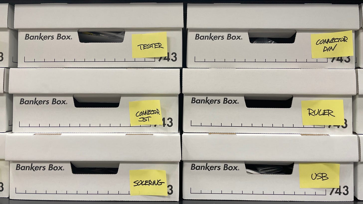 ダンボール製の小箱バンカーズボックスを組み立てて,種類ごとに資材を入れていきました.結果,研究室がなんだかスニーカー屋さんみたいになってしまいましたが,サイズがぴったりでした.