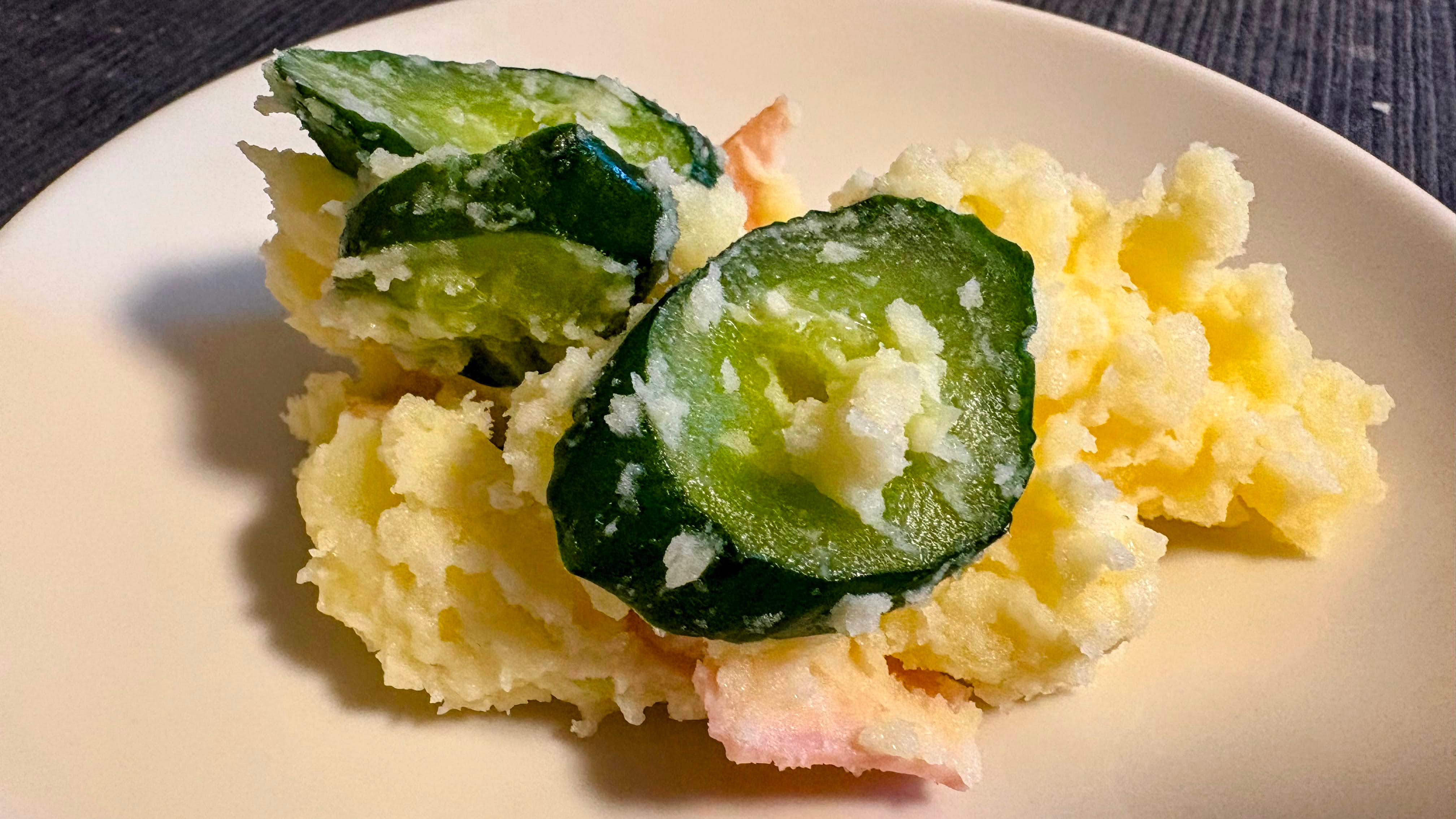帰宅してからポテサラを作ってみました.じゃがいもを茹でて,塩もみした胡瓜とハムを加えてマヨネーズで和えてみました.