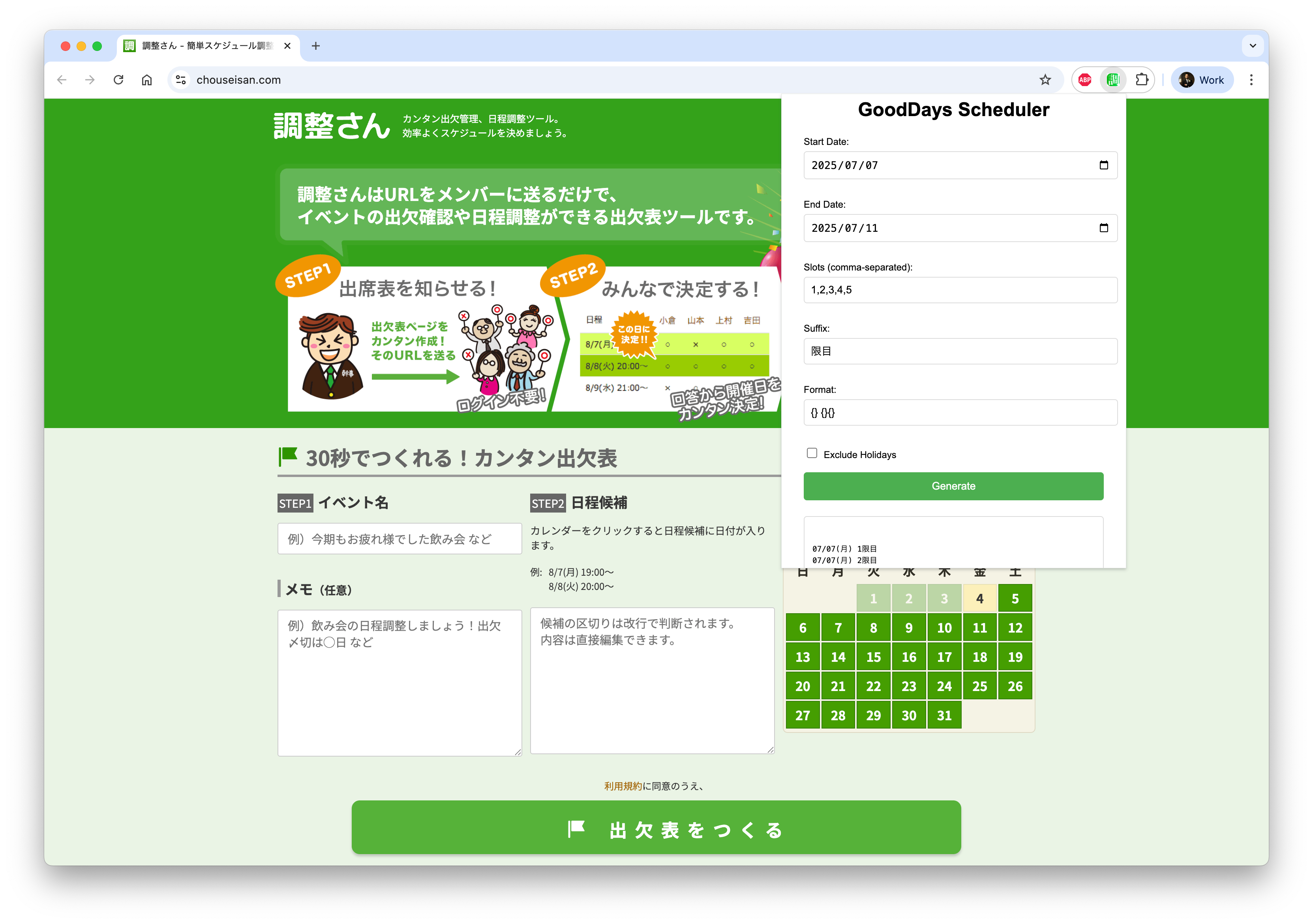調整さんは候補日をテキストでベタ打ちする必要があるのですが,そのテキストを自動生成するChrome拡張です.
