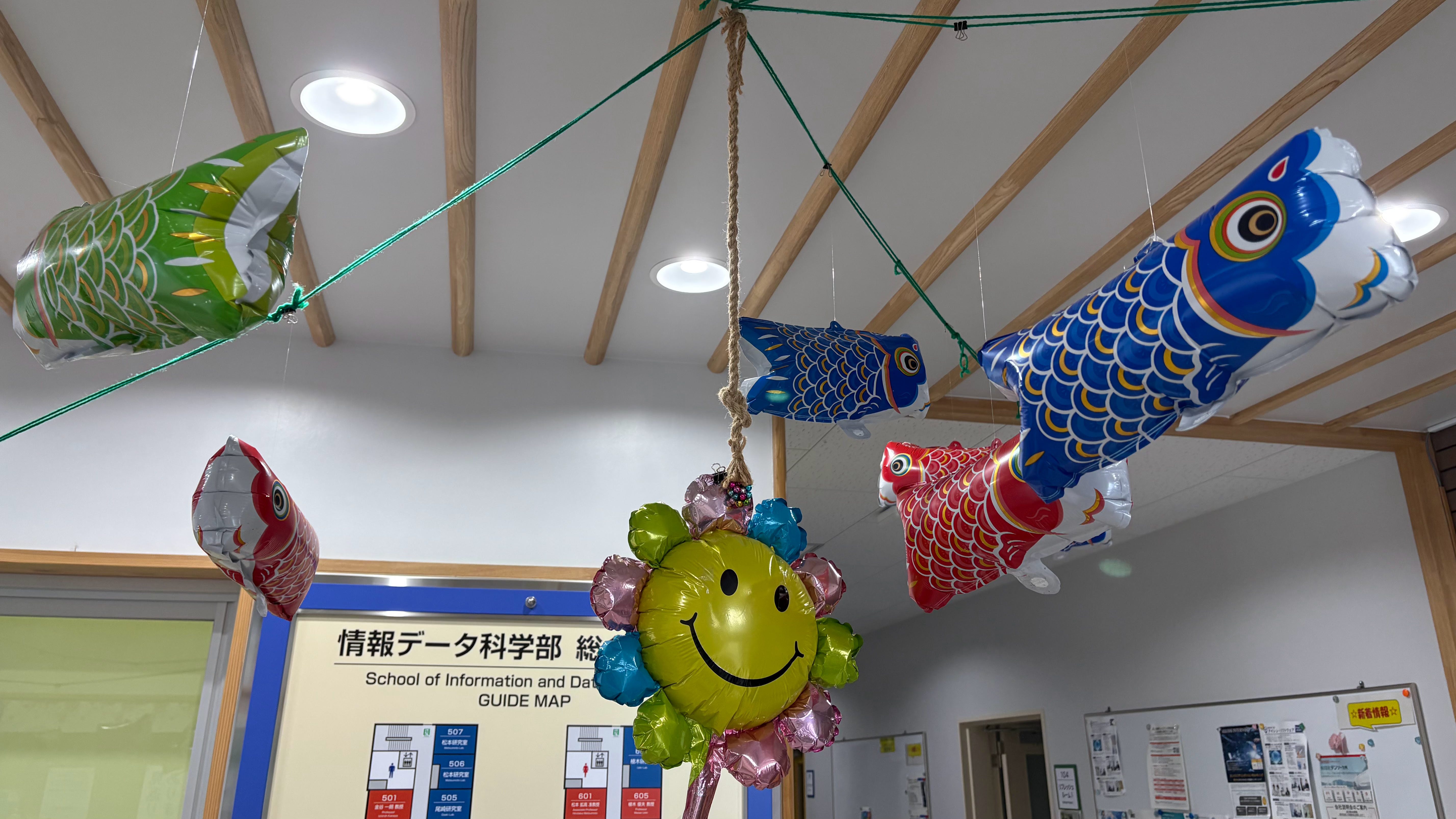 長崎大学情報データ科学部棟の入口に鯉のぼりが飾られました.