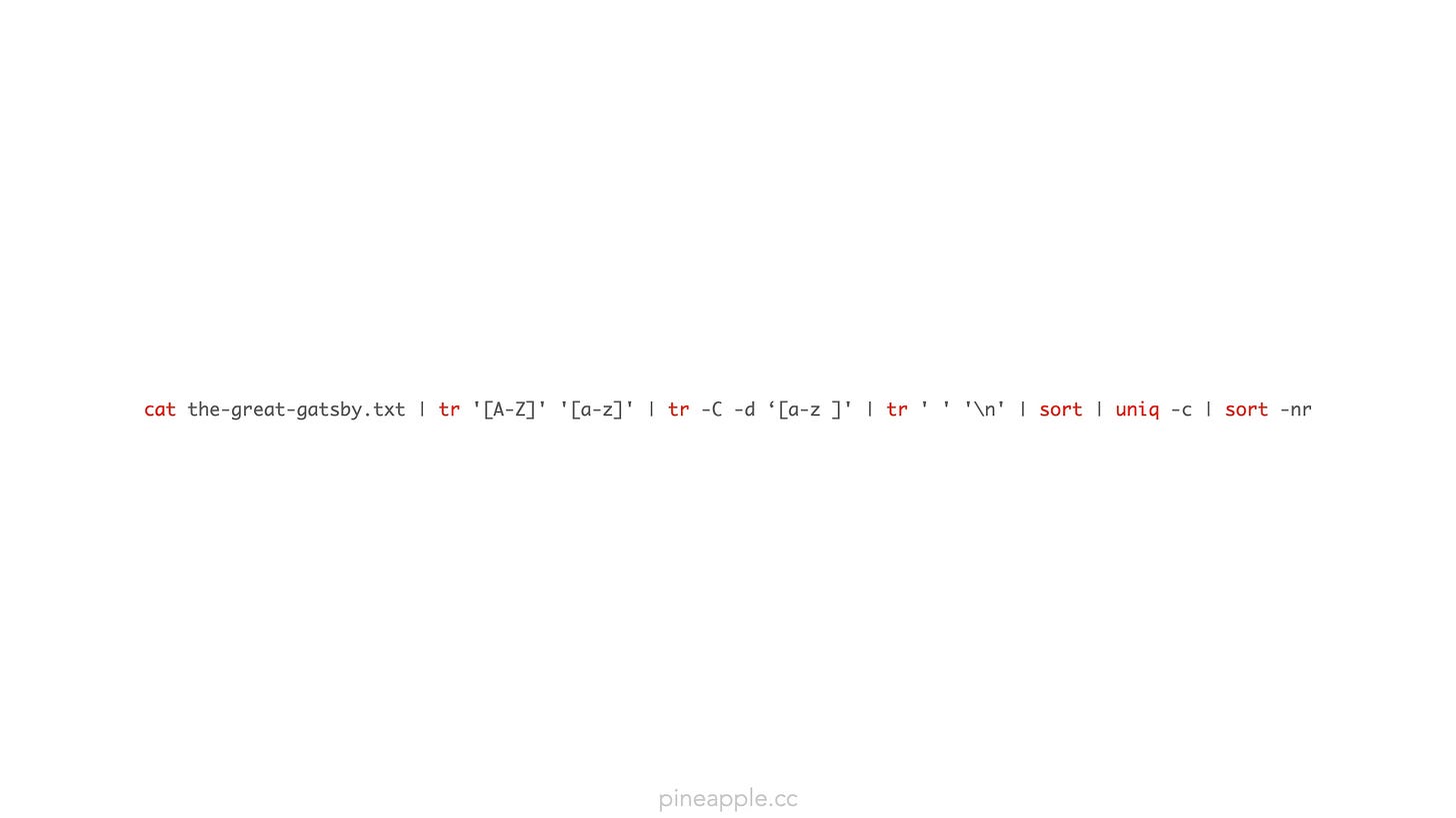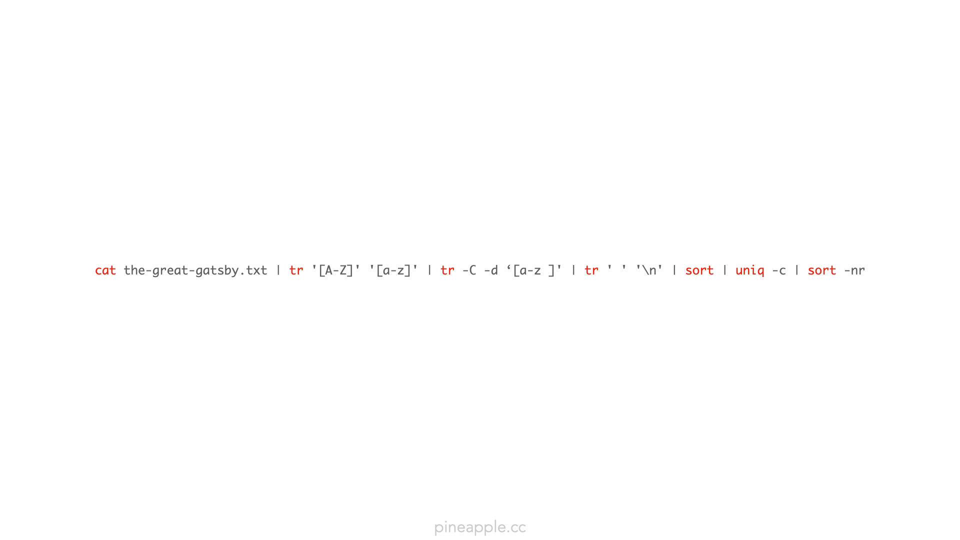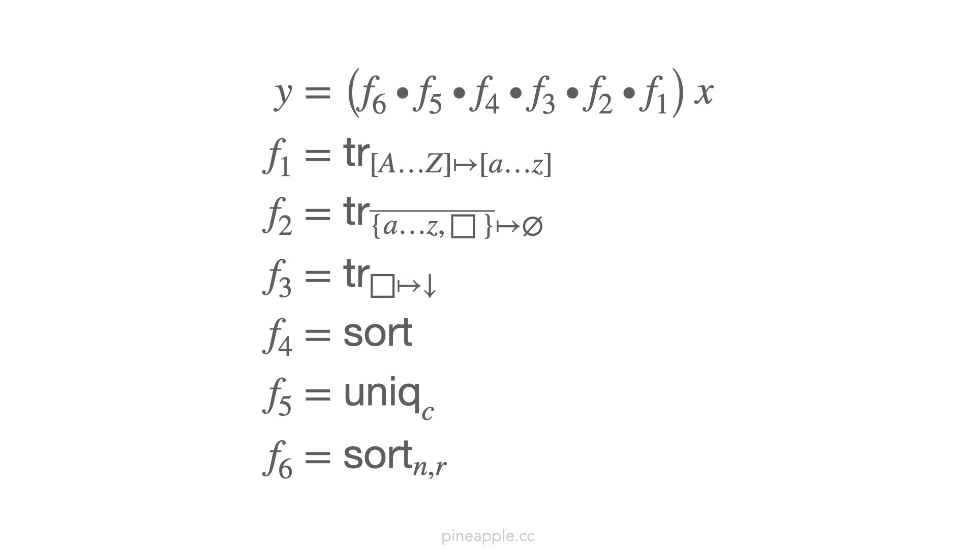 その途中に挟む人工言語ですが,Pythonである必要,あるいはプログラミング言語である必要はないかもしれません.僕たちはすでに「数学」という人工言語を持っているのですから.たとえば英文テキストファイルから単語を出現頻度順に出力する「一行野郎」を数式で書くとこうなるでしょう.